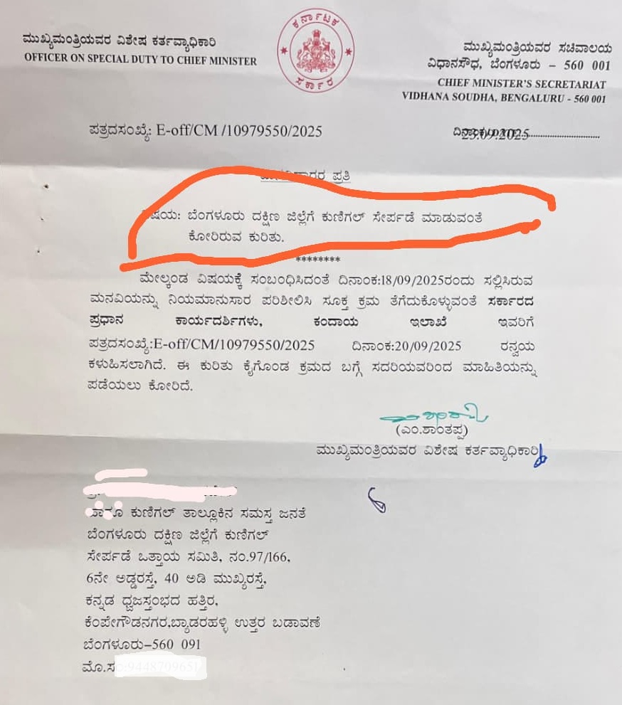 ಹೌದು. ಕುಣಿಗಲ್ ತಾಲೂಕನ್ನು ಸಂಪೂರ್ಣವಾಗಿ ತುಮಕೂರು (Tumakuru) ಜಿಲ್ಲೆಯಿಂದ ಬೇರ್ಪಡಿಸಿ ಬೆಂಗಳೂರು ಜಿಲ್ಲೆಯಲ್ಲಿ ವಿಲೀನಗೊಳಿಸುವ ಪ್ರಕ್ರಿಯೆ ಸದ್ದಿಲ್ಲದೆ ನಡೆದಿದೆ. ಇದಕ್ಕೆ ಪುಷ್ಠಿಕೊಡುವಂತೆ ʼಬೆಂಗಳೂರಿಗೆ ಕುಣಿಗಲ್ ಸೇರ್ಪಡೆ ಸಮಿತಿʼ ಮುಖ್ಯಮಂತ್ರಿಗಳಿಗೆ ಮನವಿ ಮಾಡಿದೆ. ಈ ಮನವಿ ಆಧರಿಸಿ ಮುಖ್ಯಮಂತ್ರಿ ಸಿದ್ದರಾಮಯ್ಯನವರ (CM Siddaramaiah) ವಿಶೇಷಾಧಿಕಾರಿ ಶಾಂತಪ್ಪನವರು ಕಂದಾಯ ಇಲಾಖೆ ಮುಖ್ಯ ಕಾರ್ಯದರ್ಶಿಗಳಿಗೆ ಕ್ರಮಕೈಗೊಳ್ಳುವಂತೆ ಪತ್ರ ಬರೆದಿದ್ದಾರೆ.