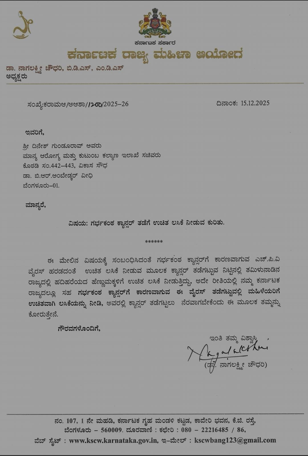 ಗರ್ಭಕಂಠ ಕ್ಯಾನ್ಸರ್ ತಡೆಯುವ ಕುರಿತು ಆರೋಗ್ಯ ಮತ್ತು ಕುಟುಂಬ ಕಲ್ಯಾಣ ಇಲಾಖೆಯ ಸಚಿವ ದಿನೇಶ್ ಗುಂಡೂರಾವ್ ಅವರಿಗೆ ಪತ್ರ ಬರೆದಿದ್ದಾರೆ.