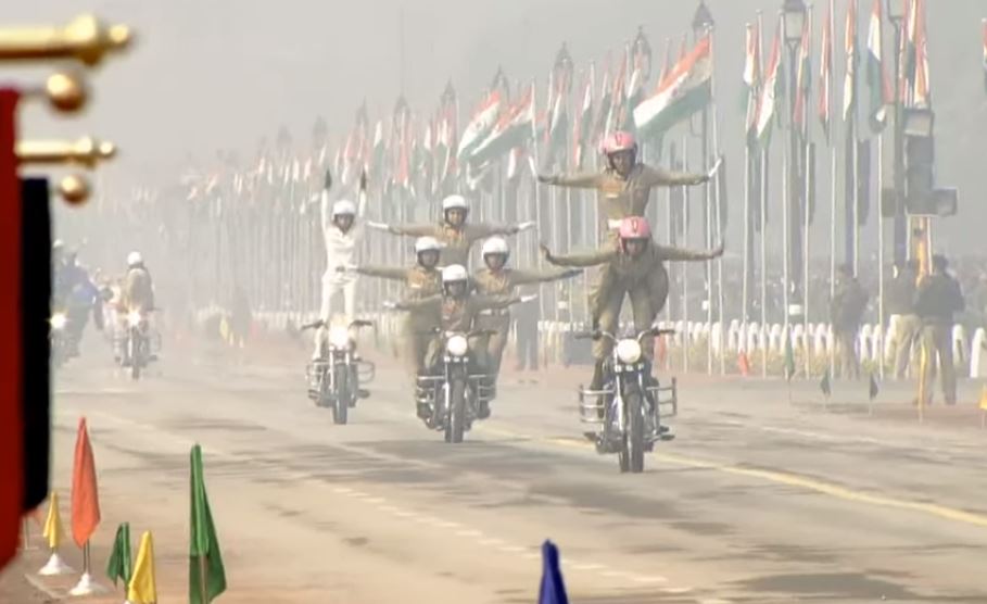 ರಾಯಲ್ ಎನ್ಫೀಲ್ಡ್ 350 ಸಿಸಿ ಬೈಕ್ ಏರಿ ಬಂದ `ಸೀಮಾ ಭವಾನಿ’ ಹೆಸರಿನ 113 ಮಂದಿ ಮಹಿಳಾ ಬಿಎಸ್ಎಫ್ ತಂಡ ತಮ್ಮ ಕೌಶಲ್ಯ ಹಾಗೂ ಧೈರ್ಯದ ಕೆಚ್ಚೆದೆಯ ಪ್ರದರ್ಶನ ನೀಡಿತು.
