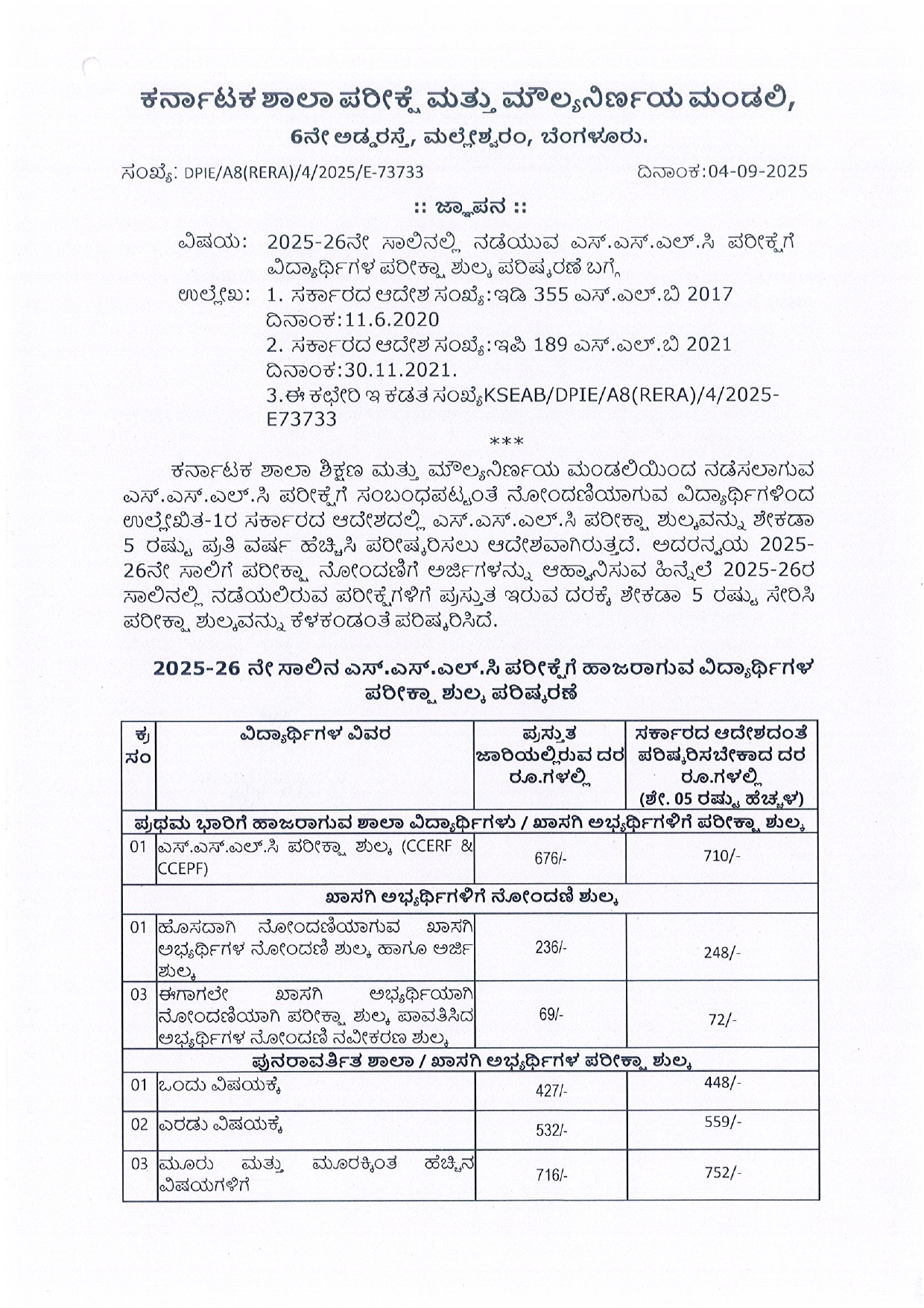 2025-26ನೇ ಸಾಲಿನ ಪರೀಕ್ಷಾ ಶುಲ್ಕವನ್ನು 5% ಏರಿಕೆ ಮಾಡಿ ಕರ್ನಾಟಕ ಶಾಲಾ ಪರೀಕ್ಷಾ ಮತ್ತು ಮೌಲ್ಯ ನಿರ್ಣಯ ಮಂಡಳಿಯಿಂದ ಆದೇಶ ಹೊರಡಿಸಿದೆ. ಅದರನ್ವಯ 2025-26ನೇ ಸಾಲಿನಲ್ಲಿ ನಡೆಯಲಿರುವ ಎಲ್ಲಾ ಪರೀಕ್ಷೆಗಳಿಗೆ ಪ್ರಸ್ತುತ ಇರುವ ದರಕ್ಕೆ ಶೇ.5 ರಷ್ಟು ಸೇರಿಸಿ ಶುಲ್ಕ ವಿಧಿಸಲಾಗುತ್ತದೆ ಎಂದು ಆದೇಶದಲ್ಲಿ ತಿಳಿಸಲಾಗಿದೆ.
